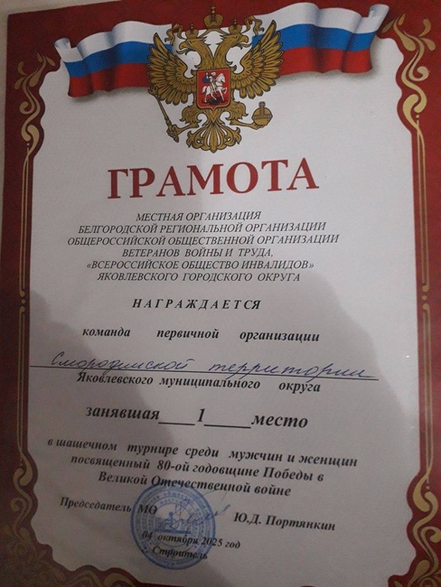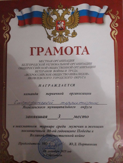В минувшие выходные в Центре культурного развития «Звездный» состоялся шахматно- шашечный турнир среди мужчин и женщин организации ветеранов войны, труда и общества инвалидов Яковлевского муниципального округа, посвященный 80-ой годовщине Победы в Великой Отечественной войне. Команда первичной организации Совета ветеранов Смородинской территории заняла первое командное место в шашечном турнире и третье командное место в шахматном турнире. Поздравляем команду с наградами и желаем не останавливаться на достигнутом!