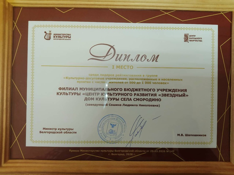 Одно из лучших учреждений культуры! Сегодня в Белгородском государственном центре народного творчества состоялось торжественное мероприятие, посвященное достижениям в сфере культурно-досуговых учреждений. В рамках события состоялась церемония награждения лидеров рейтингования культурно-досуговых учреждений, методических служб и Домов ремёсел по итогам 2025 года. Дом культуры села Смородино занял почётное I место. От всей души поздравляем коллектив и руководителя с заслуженной наградой! Ваш труд — это весомый вклад в сохранение и приумножение культурного наследия Белгородской области. Желаем коллективу неиссякаемой энергии, вдохновения и новых профессиональных побед!